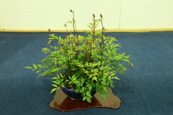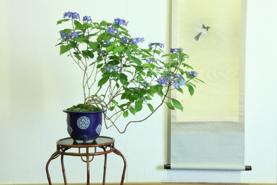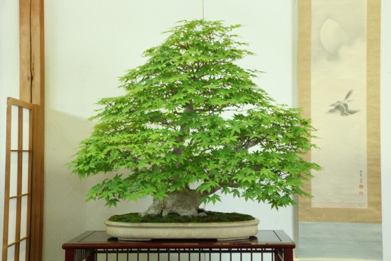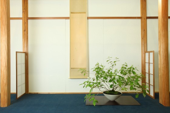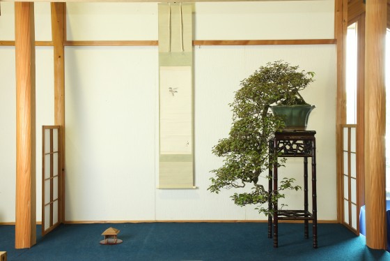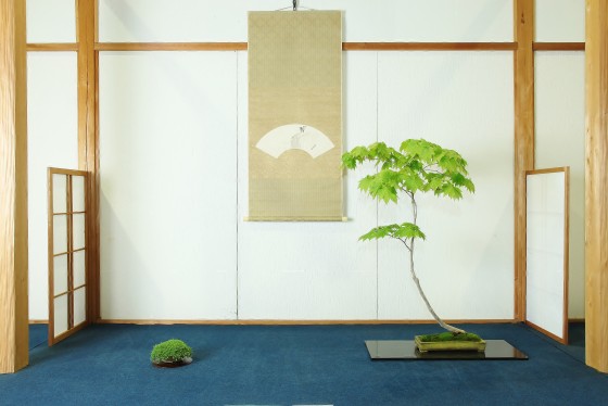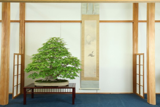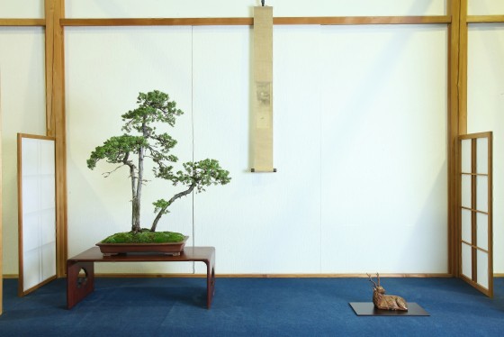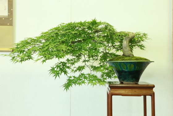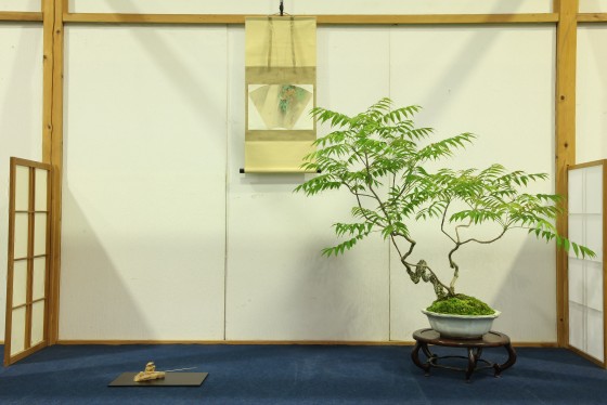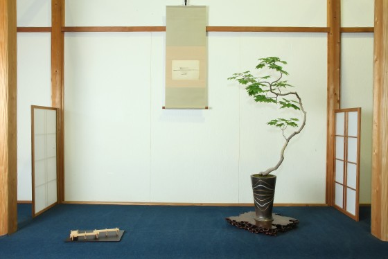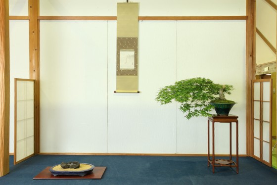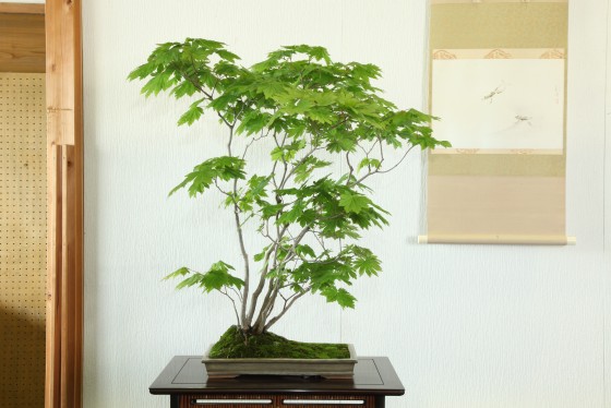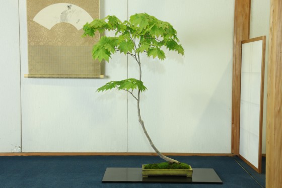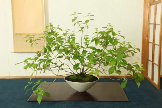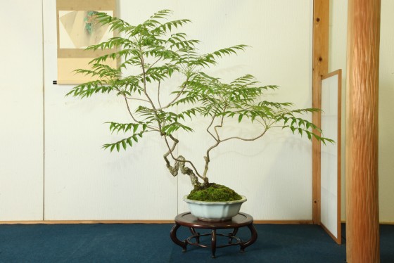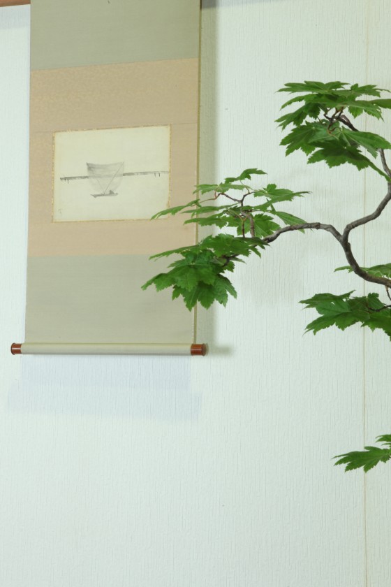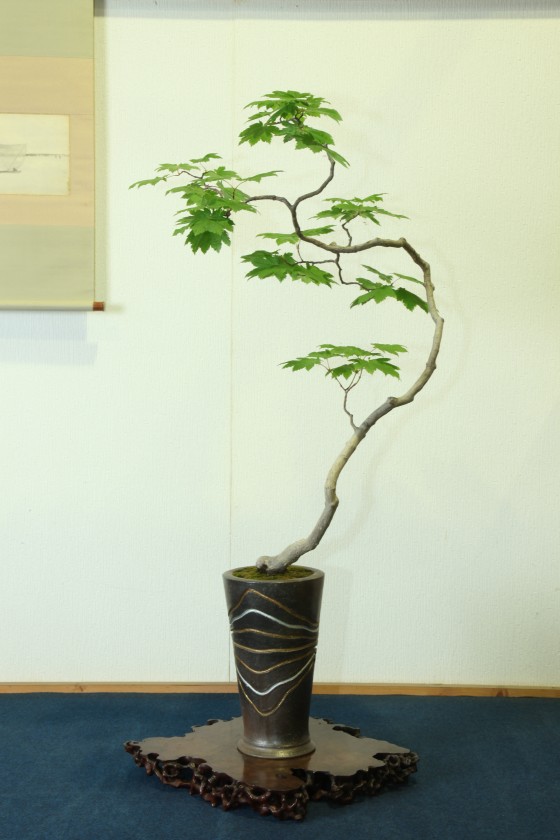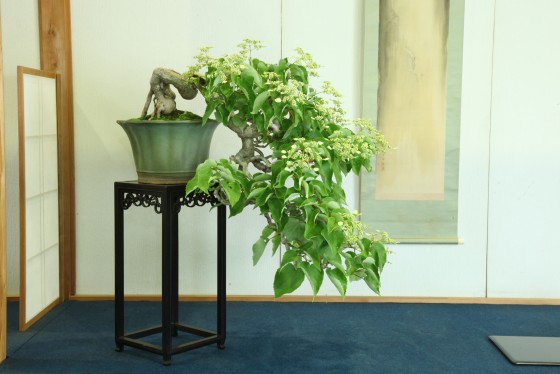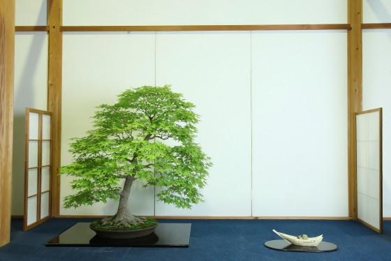 ひとつの幹から株状に広がる樹姿。“目に青葉、山ほととぎす…”の名句を盆栽で表現した季節感満点の席です。