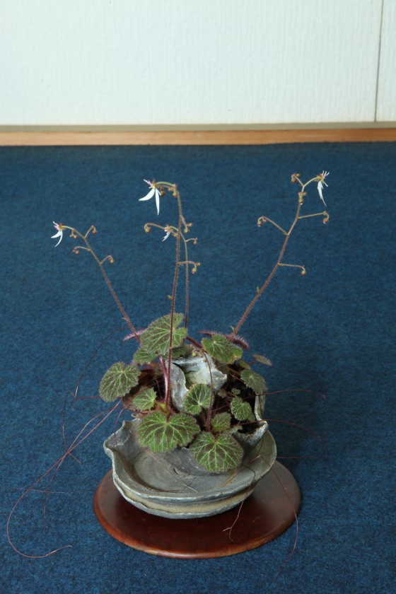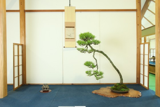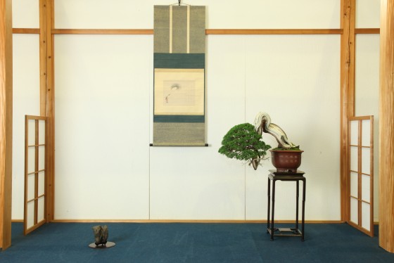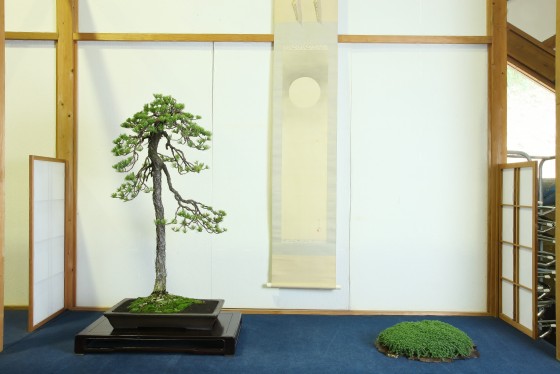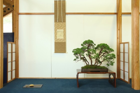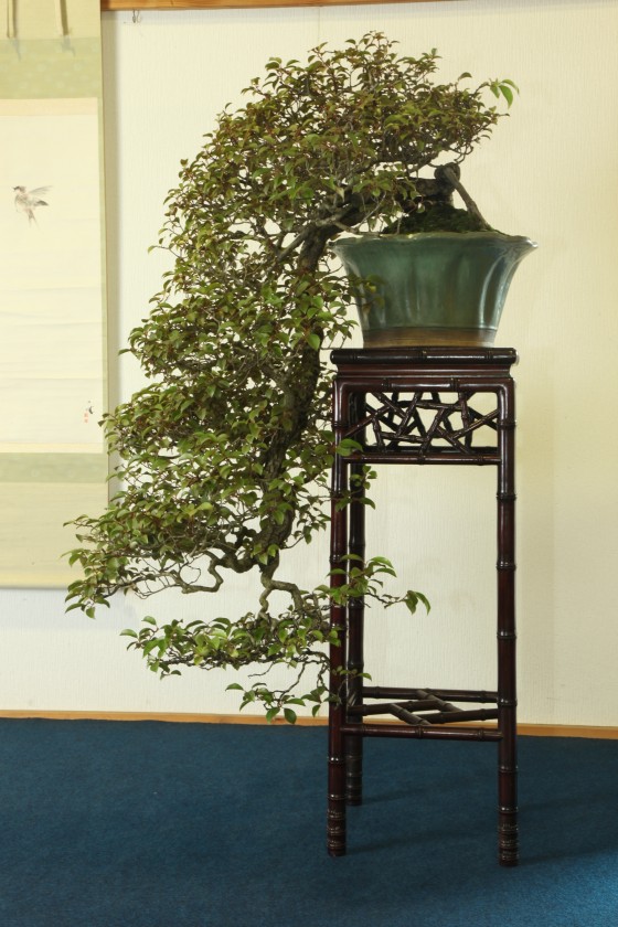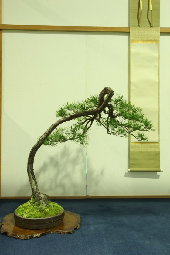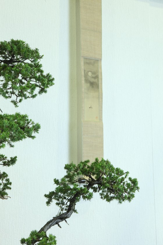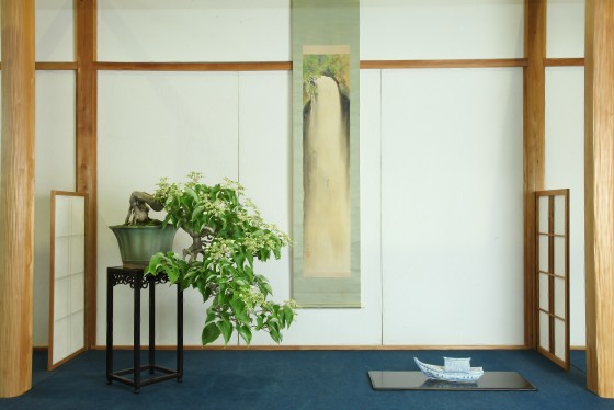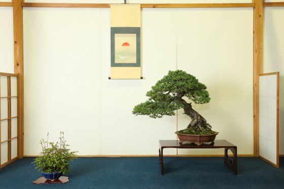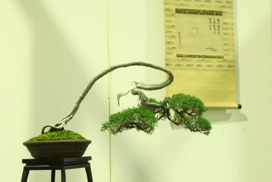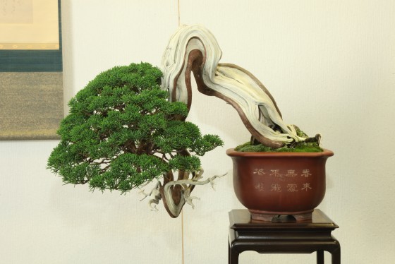 滝の様に懸垂する姿を見事な培養で均整を見せるのは盆栽界第一人者と謳われる作家ならではのもの。季節の軸、主木に合わせて木彫も見事です。