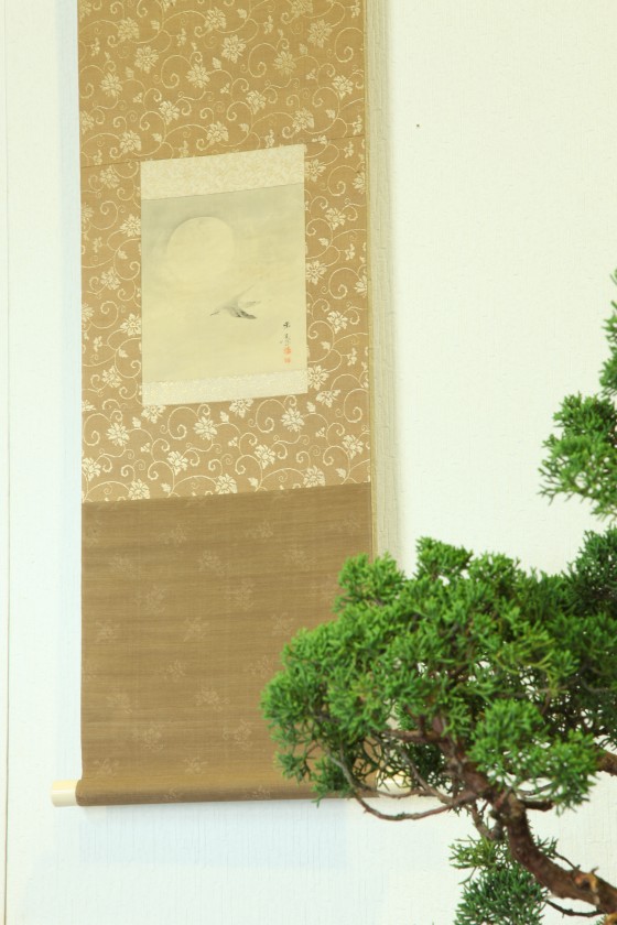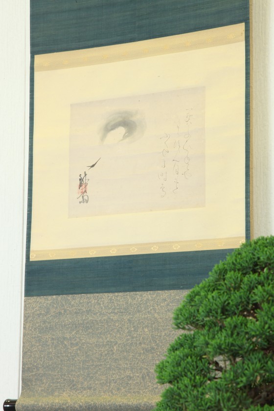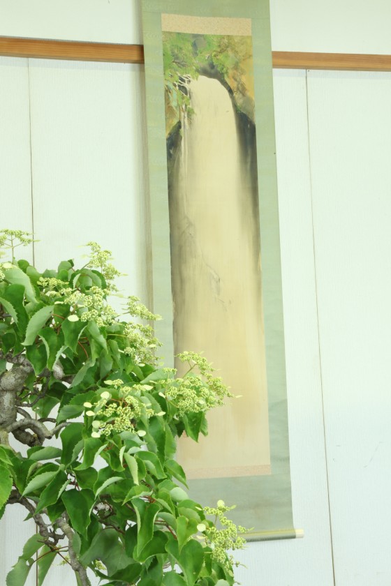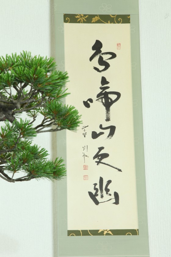 崖上から懸垂する真柏。対山に見える渓谷の瀑布。茶掛の古筆が興趣を加え
