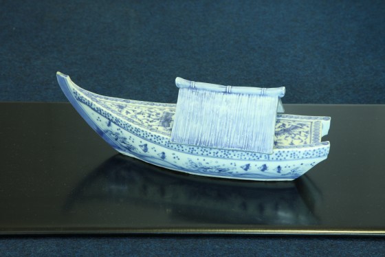 清冽な瀑布の飛沫を受ける岩がらみは今が花季です。染付の舟がその景趣を扶け(たすけ)、深山渓谷の世界この一席にあり。