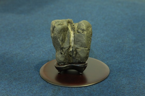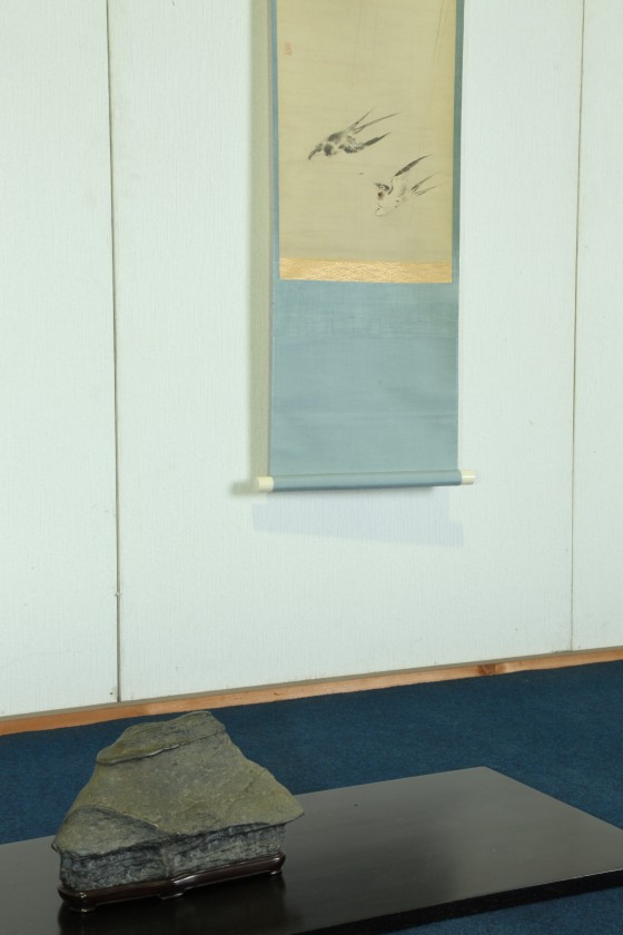 雨中を飛び交う二羽の燕。水石に季節感を与えた見事な一席です。