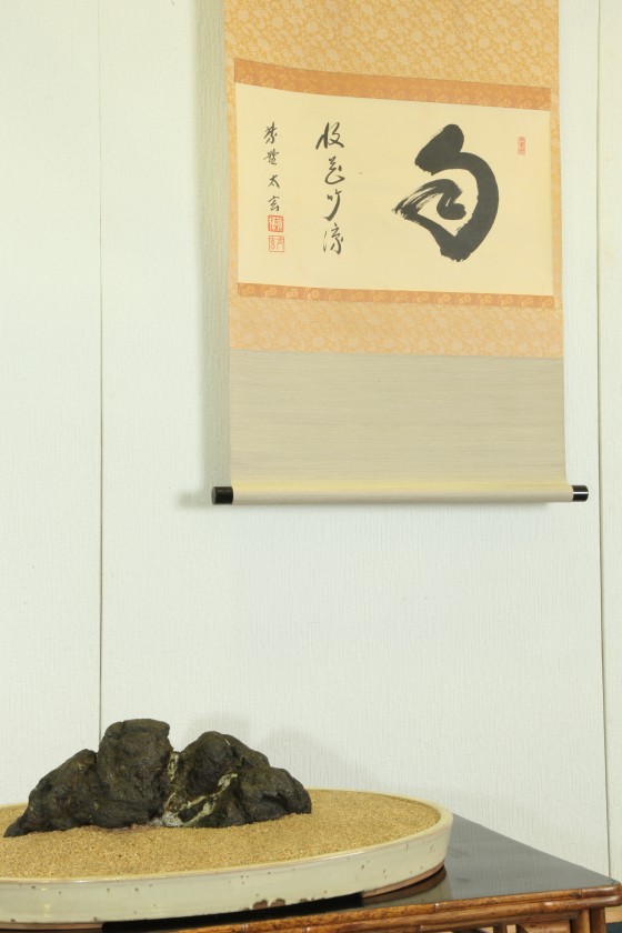 帝都名庭八芳園の茶室に飾られた歴史を持つ樹を名匠の手により伸びやかな現在の姿に改作したものです。軸・添共に王道の飾りです。