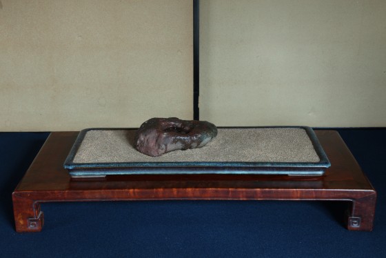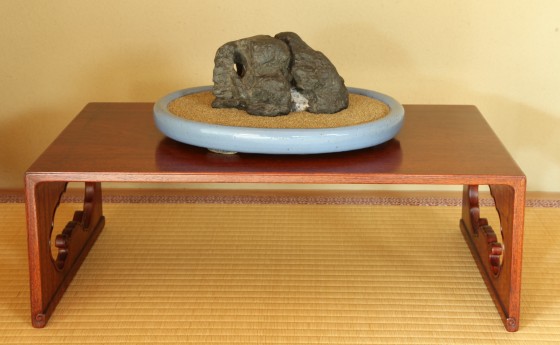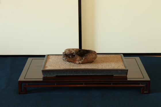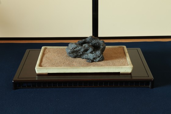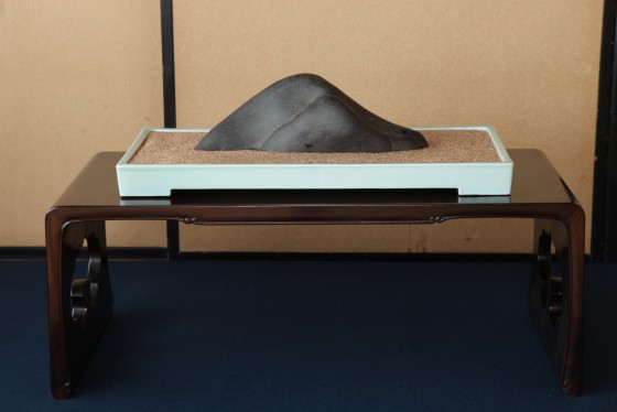 瀬田川梨地の名石「近江路」。配する水盤は、名工 井上良斎の青磁。