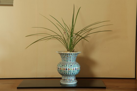 右手に飾られた「中国蓮弁蘭」に使用される盆器は、本来美術的花瓶として珍重される