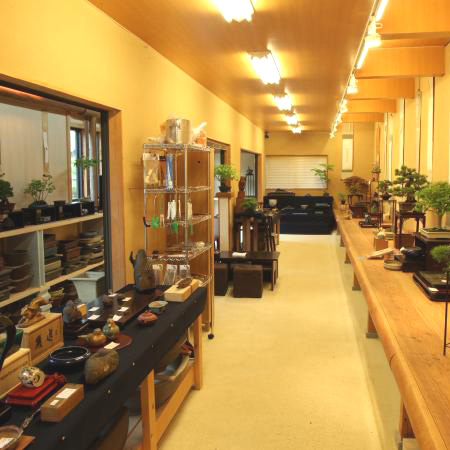 国内最大級、約1000点を超える盆器・卓・添景・掛け軸など栽界を代表するコレクションを誇る展示室です。