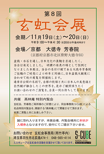 研鑽の発表の場として恒例となりました本展は、当会の名付け親である大徳寺芳春院ご住職のご好意により昨年と同様に、日本盆栽大観展に合わせて秋の展覧を開催致します。
